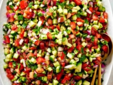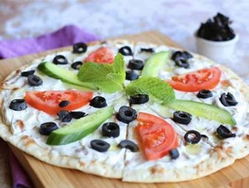 Homemade fresh dough, spread witgh labneh mixed with cucumber, tomatoes, black olives, fresh mint , and olive oil