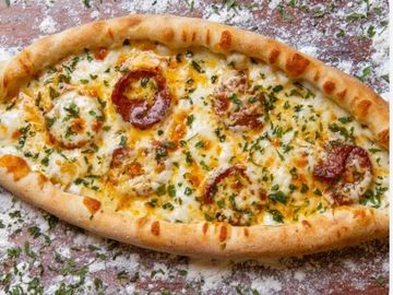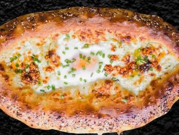 Homemade fresh dough, cheese, egg , soujouk, and sesame seeds on top