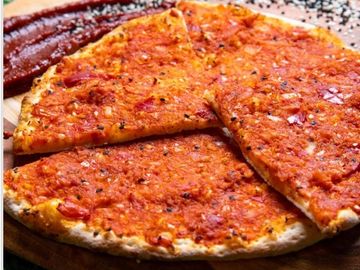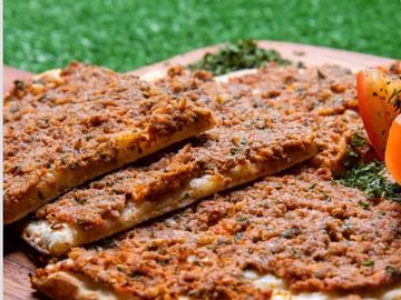 Homemade fresh dough, spread with marinated ground meat mixed with tomatoes, parsley and onions.