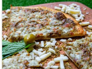 Homemade dough, zaatar, lebneh, cucumber, tomato, fresh mint, and black olives.