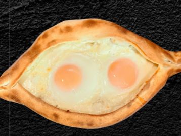 Homemade fresh dough, cheese, egg , and topped with sesame seeds .