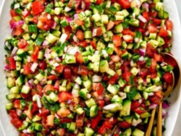 Homemade dough, mozzarella cheese, tomatoes, cucumber , fresh mint black olive.
